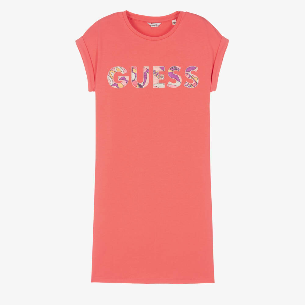 From American brand Guess, a comfortable coral pink T-shirt dress for teen girls. Casual and stylish, it has the designer's logo across the chest in patterned letter appliqués. It is made in soft cotton jersey and has seamless capped sleeves with turn-up cuffs.