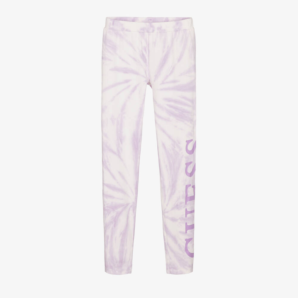Ivory and lilac purple tie-dye leggings for teen girls by Guess, printed with the brand's signature logo on one leg. Easy to wear and style, these cotton jersey leggings have an elasticated waistband for comfortable wear.