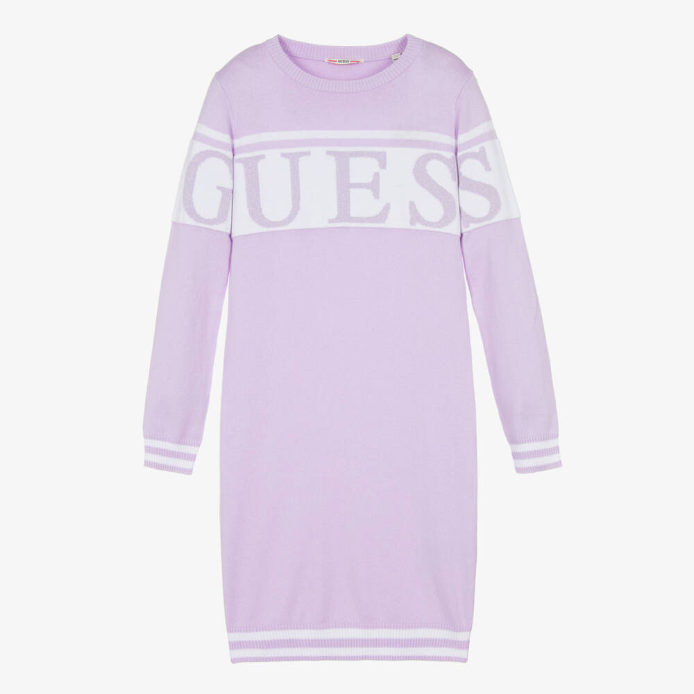 Lilac-purple sweater dress for teen girls by American brand Guess, knitted in a soft viscose and cotton blend. This cool style has purple and silver jacquard branding across the front, back and sleeves, adding a little sparkle to her outfit. Complementing the look are the striped cuffs and hem in white.