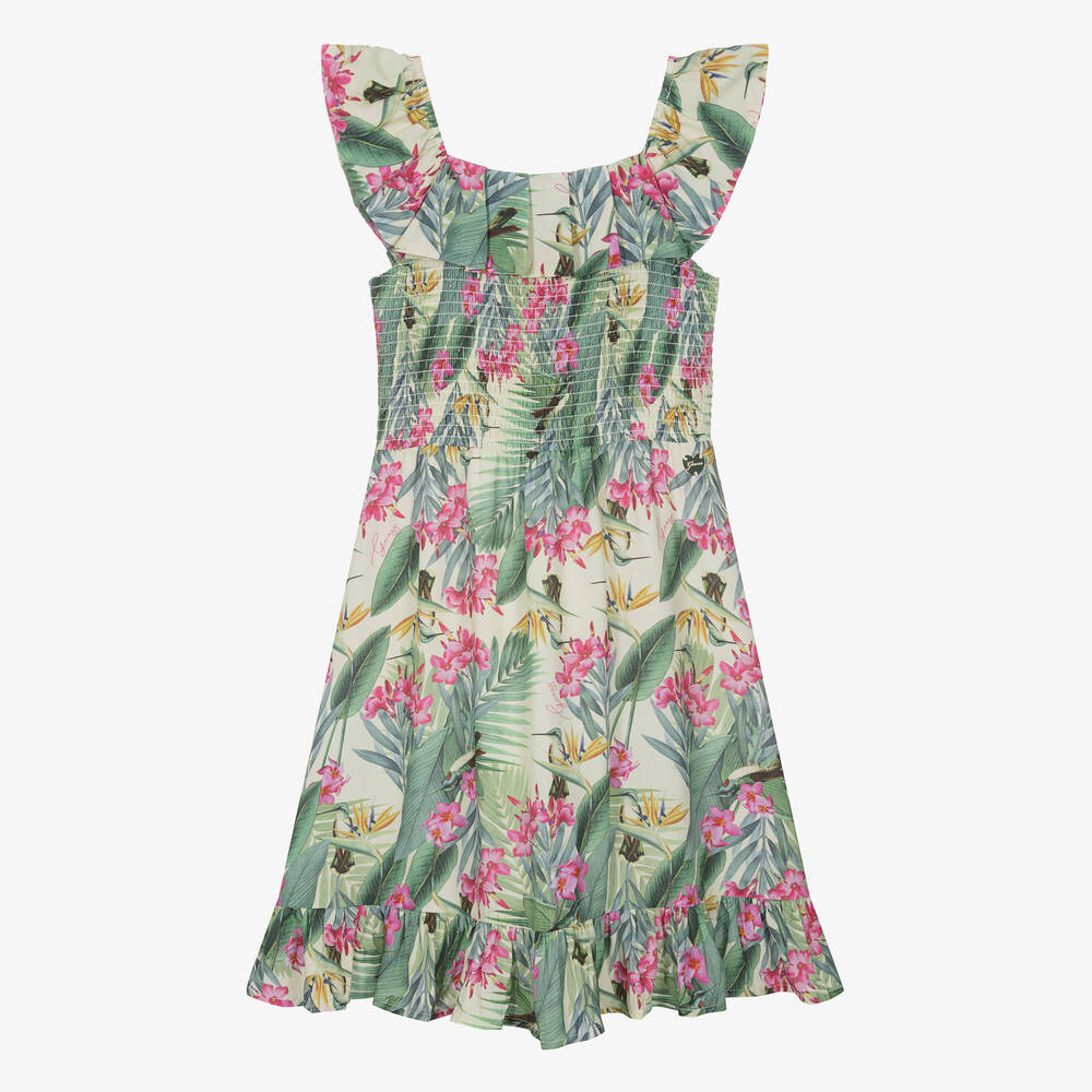 Romantic, summery dress for teen girls by American brand Guess, with a vibrant tropical flower, logo and hummingbird print, in shades of pink and green on a pastel yellow background. Just right for warm days, it is cool and unlined, with a pleated, ruffled neckline, elasticated frills over the shoulders and a stretchy, ruched bodice. It has a gathered skirt with a shiny gold, heart-shaped, metal logo badge sewn on the waist, and a ruffle around the hemline. Beautifully comfortable, it is made in a soft, lightweight viscose blend and is easy to wear, simply pulling on.
