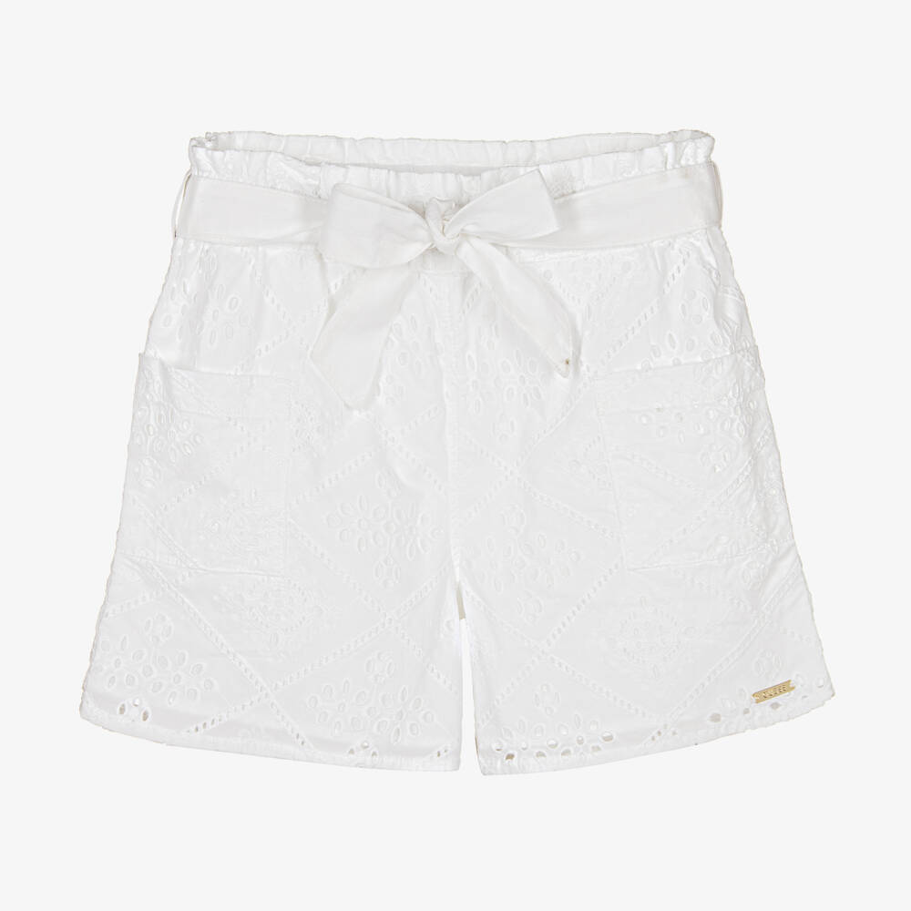 Gorgeous white cotton shorts for teen girls by American brand Guess, made in soft broderie anglaise cotton. Summery and with a 50's vibe, they are loose-fitting with patch pockets on the front and a detachable tie belt on the comfortable, elasticated waist. They are fully lined for comfort and have a golden metal logo tab sewn on one cuff for a designer finish.