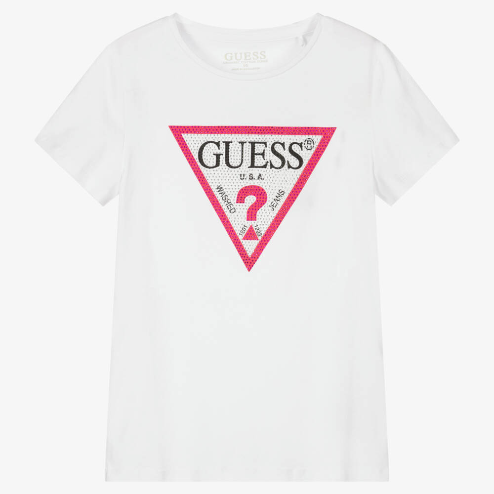 Sparkle in style with this white cotton T-shirt for teen girls by Guess, showcasing a large Triangle logo on the front with diamanté embellishments. It is classically cut and made in a soft jersey for all-day comfort.