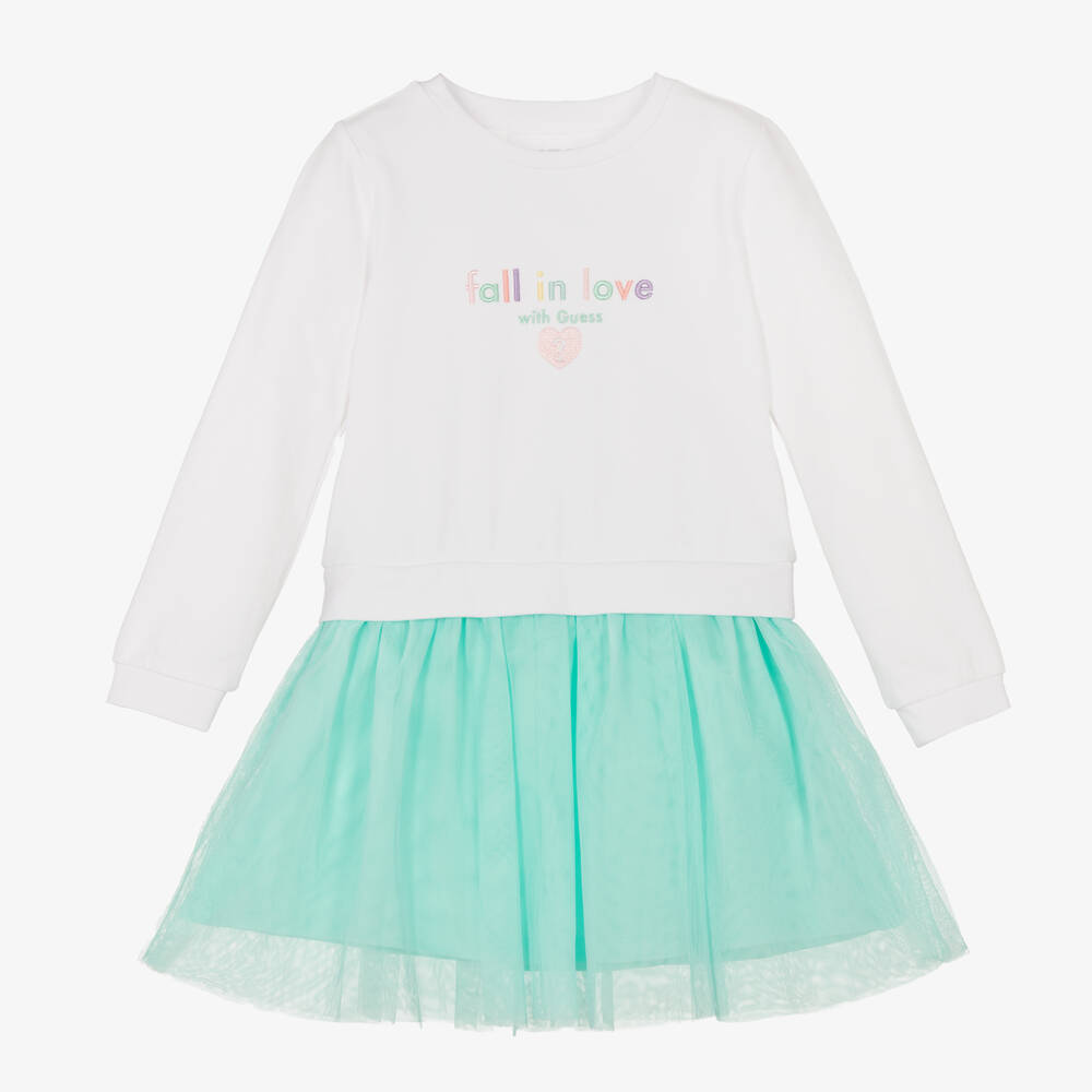 White cotton jersey and aqua green tulle dress for girls by Guess. This comfortable and easy-to-wear style has the appearance of a two-piece, with a sweatshirt style top and a pretty gathered tulle skirt. On the front, it has an embroidered slogan and logo design in lovely pastel shades.