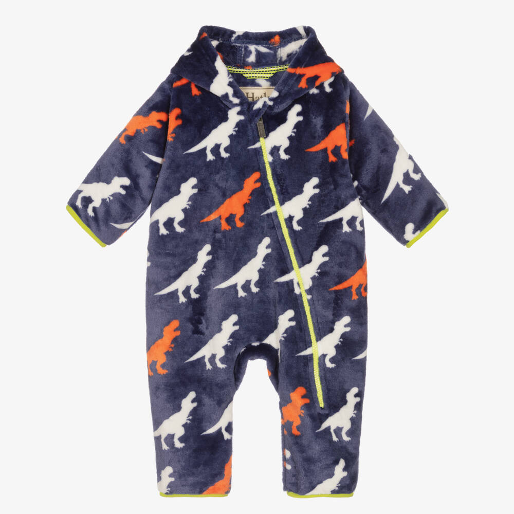 Navy blue pramsuit for baby boys by Hatley, made in super soft fleece. In a fun dinosaur silhouette print, this adorable layer has a full length zip fastening on the front for practicality. Cute and cosy, it has a snug hood and fold over scratch mitts and booties for added warmth.