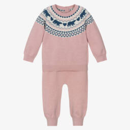 A lovely pink marl trouser set for baby girls by Canadian brand Hatley, finely knitted in soft cotton. The top has an adorable baby fawn motif on the front, with raglan sleeves and back button fastenings. The trousers have a gently elasticated waist, finished with a sweet little bow on the front. Both pieces have stretchy ribbed trims for a comfortable fit.