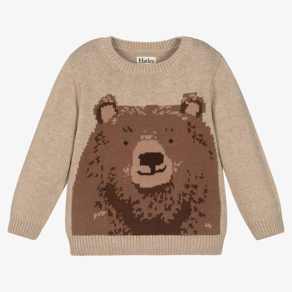 A lovely beige sweater for little boys by Canadian brand Hatley, knitted in a soft cotton blend. Great for layering, this warm, long-sleeved piece has a comfortable crew neck and a dark brown intarsia knit bear on the front. The ribbed trims finish this cosy design.