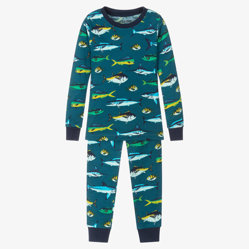 Turquoise blue cotton pyjamas for boys from Little Blue House by Hatley. Snug fitting, both pieces have a colourful all-over fish pattern and the bottoms have an elasticated waist for comfort throughout the night.