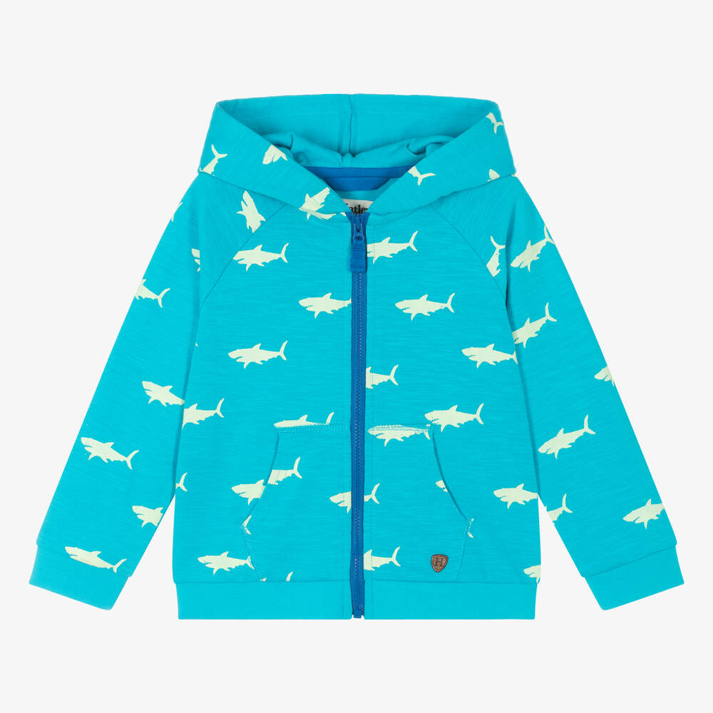 Glow in the dark, this shark-patterned turquoise blue hooded zip-up top for younger boys is by Hatley. Comfortable and cosy for layering, it is made in mid-weight, slub cotton jersey with a lined hood and long sleeves. There are patch pockets on the front with a brown logo tab and a bright blue front zip for contrast.