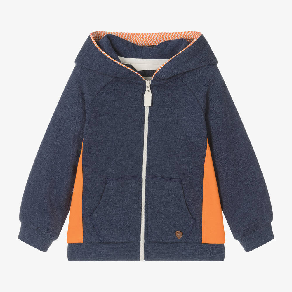 Dark blue zip-up hoodie for younger boys by Hatley, made in mid-weight cotton jersey with a soft, fleecy inside. Adding a fun pop of colour, this casual top has bright orange side panels that coordinate with the orange and white braided trim on the jersey-lined hood. There is a white zip fastening and pouch pocket on the front detailed with a small logo patch for a subtle designer finish.