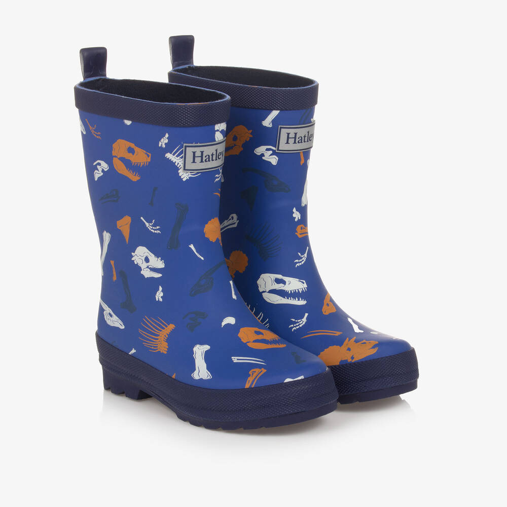 Blue slip-on rain boots for boys by Hatley, made from smooth rubber. Designed with a fun dinosaur fossils print, they are lined in soft cotton jersey and have a non-slip rubber outsole for good grip. The cotton-blended insoles are comfortably padded and there are reflective logo patches on the front for an added touch of branding.