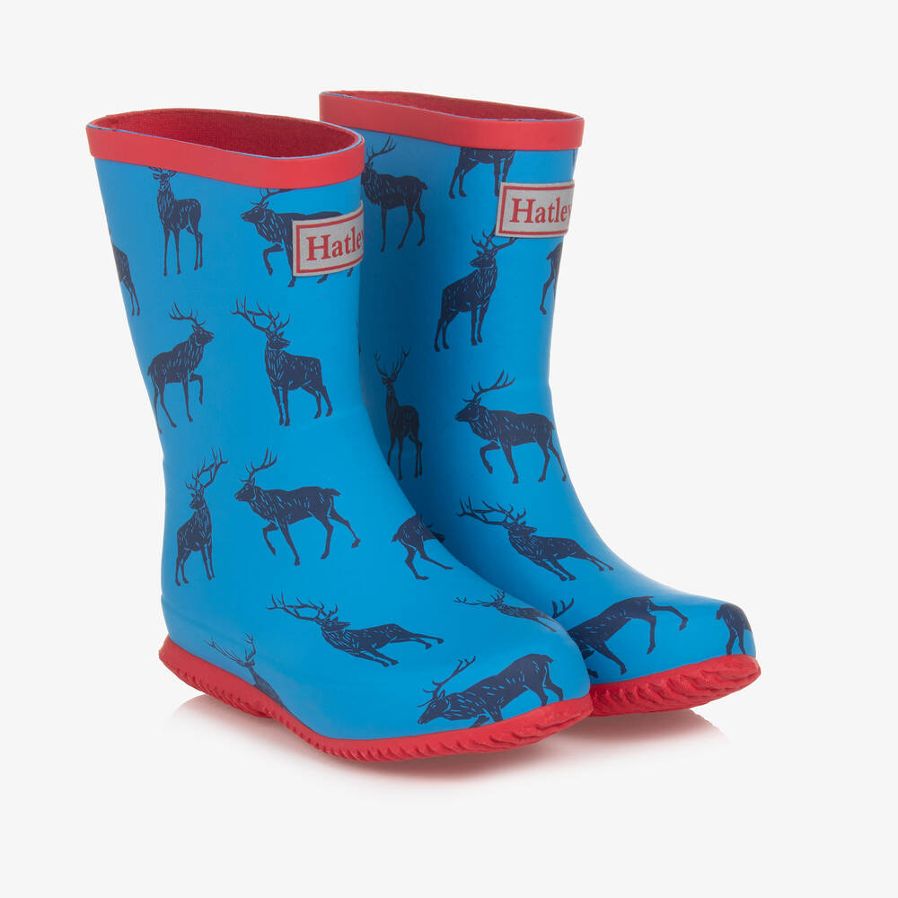 Blue slip-on rain boots for boys by Hatley, with a navy blue elk pattern and bright red trims. Made from smooth and flexible rubber, they are foldable for easy storage and have a soft jersey lining with a removable, lightly padded insole for comfortable wear. They have reflective logo details on the front for a branded finish. The non-slip rubber outsole is ridged for good grip.