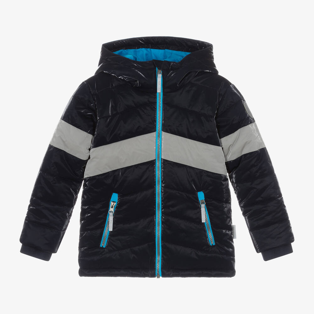 Navy blue hooded puffer coat for boys by Canadian brand Hatley, with a contrasting grey chevron stripe. Made in silky fabric with a shiny finish, this lightweight coat has a satin lining and warm padding for comfortable wear in the colder seasons. The sleeves have hidden ribbed cuffs and the zip fastenings have reflective pullers that are easy for little hands.
