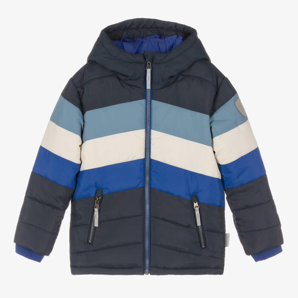 Navy blue hooded puffer coat for boys by Hatley, with blue and white chevron stripe panels. Fully lined and water repellent, it has an easy-grip zip puller, with protective chin guard, and two zipped pockets to keep little hands warm. The cuffs are ribbed and elasticated to keep out cold winds. There is a reflective safety logo patch on the sleeve.