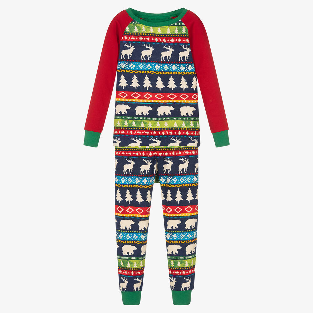 Fun blue pyjamas for boys by Canadian brand Hatley, made in soft and stretchy organic cotton jersey. These snug-fitting pyjamas are patterned in a colourful festive winter print with contrasting red sleeves and green ribbed trims. For an extra designer touch, there is an embroidered logo on the back of the neck. The matching bottoms have a gently elasticated waist for a comfortable fit.