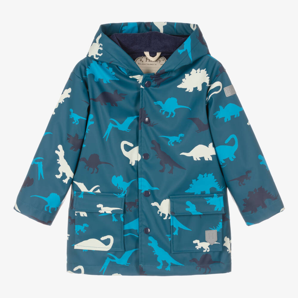 Blue hooded raincoat for boys from Hatley. Made from impermeable waterproof materials, it has a playful blue and white dinosaur print all-over. For a fun, contemporary twist, the white dinosaurs become green when wet. Lined in a super soft and breathable microfibre fleece, it fastens with matching poppers on the front. It has front flap pockets to keep little hands warm. For safety, it has reflective logo patches on the sleeve and front pocket for extra visibility.
