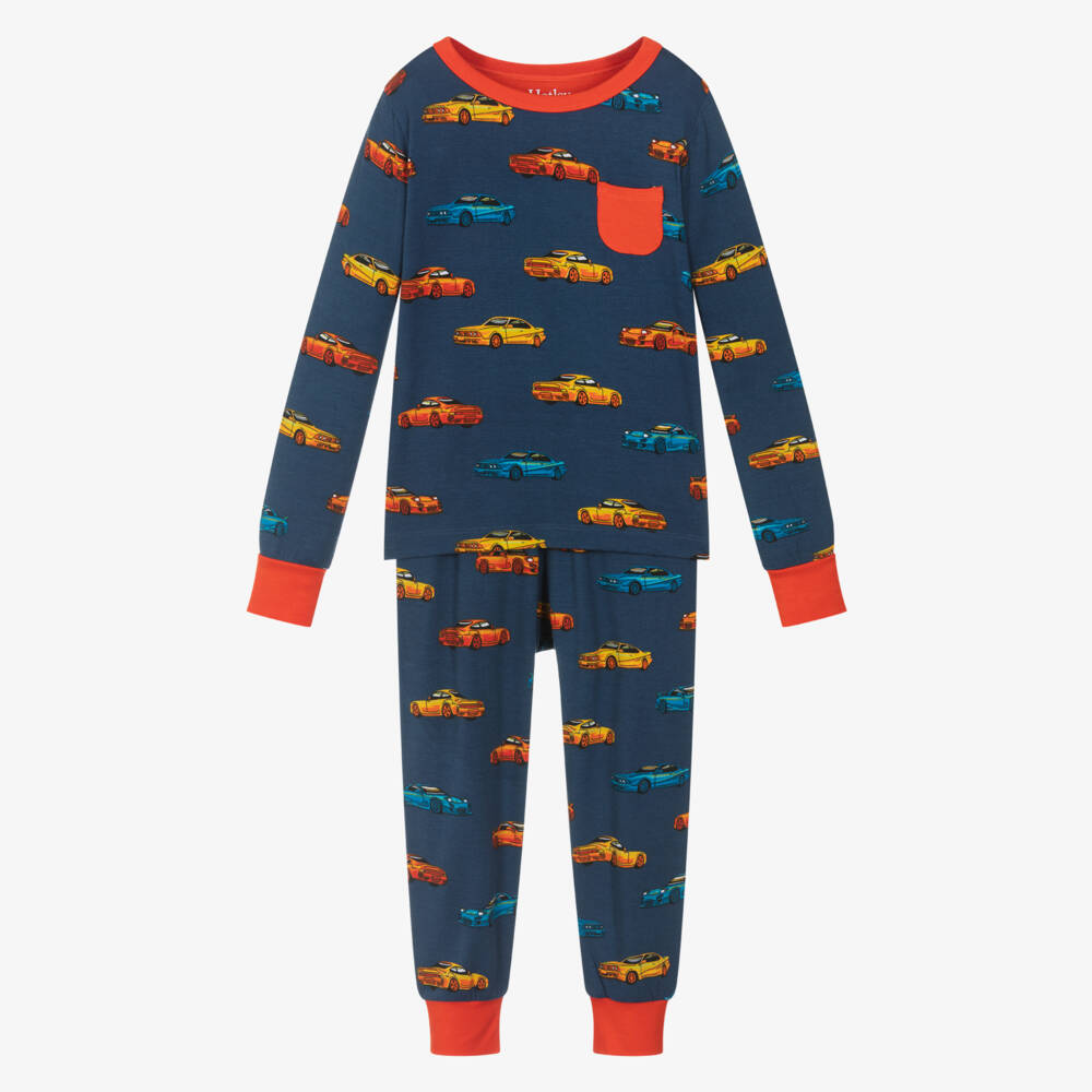 Patterned in a colourful car print, these navy blue and red pyjamas for boys are by Hatley. Designed to fit snugly, they are made in soft and lightweight bamboo viscose jersey. The top has a small chest pocket and the trousers have a gently elasticated waist.
