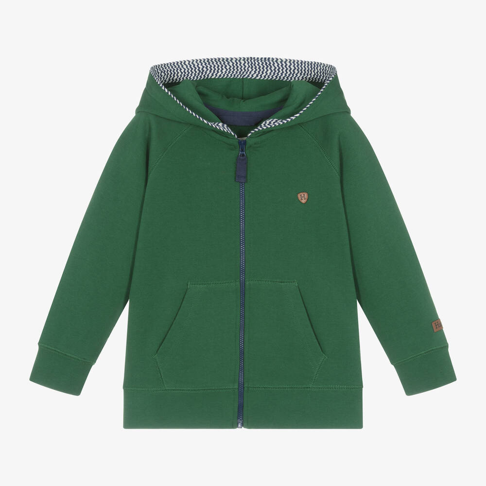 Dark green zip-up hoodie for boys by Hatley, made in soft, mid-weight cotton jersey. In a comfortable casual style, it fastens with a contrasting blue zip and has coordinating blue and white braided trims on the hood. There are stretchy ribbed trims and a useful pouch pocket on the front, with logo patches on the chest and sleeve adding a stylish designer finish.