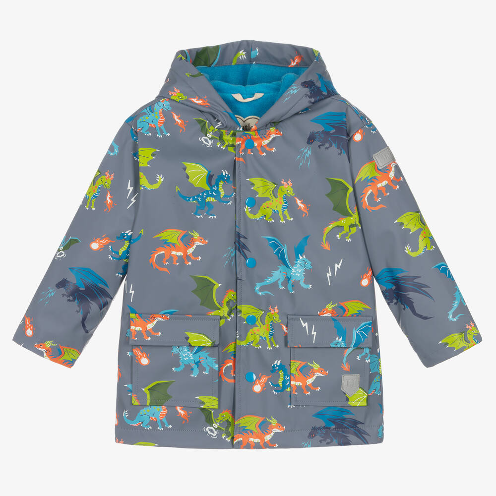 Grey-blue hooded raincoat by Hatley, great for keeping your little boy protected from the rain. Made from impermeable waterproof materials, it has a fun green, orange, and blue dragon print all-over. Lined in a super soft, breathable microfibre fleece, it fastens with blue poppers on the front. It has front flap pockets to keep little hands warm. For safety, it has reflective logo patches on the sleeve and front pocket for extra visibility.