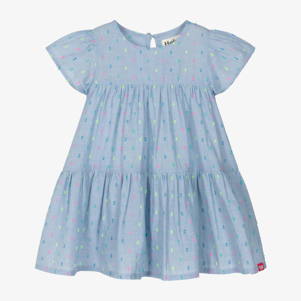 Light blue dress for little girls by Hatley, patterned in colourful tufts of embroidery. Woven in lightweight cotton, this pretty tiered style has flutter sleeves and a keyhole button fastening on the back. Smaller sizes come with a pair of white jersey knickers.