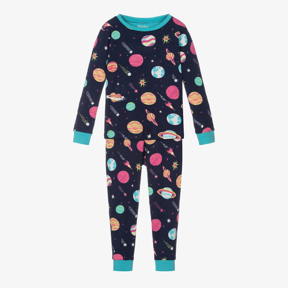 Navy blue cotton pyjamas for girls by Canadian brand Hatley. Patterned in a colourful galaxy print, these comfortable, snug-fitting jersey pyjamas are beautifully soft on delicate skin. The top is embroidered with a contrasting blue logo on the back of the neck for a subtle designer finish. The bottoms have a gently elasticated waistband for comfortable wear. These pyjamas contain at least 95% organic cotton.