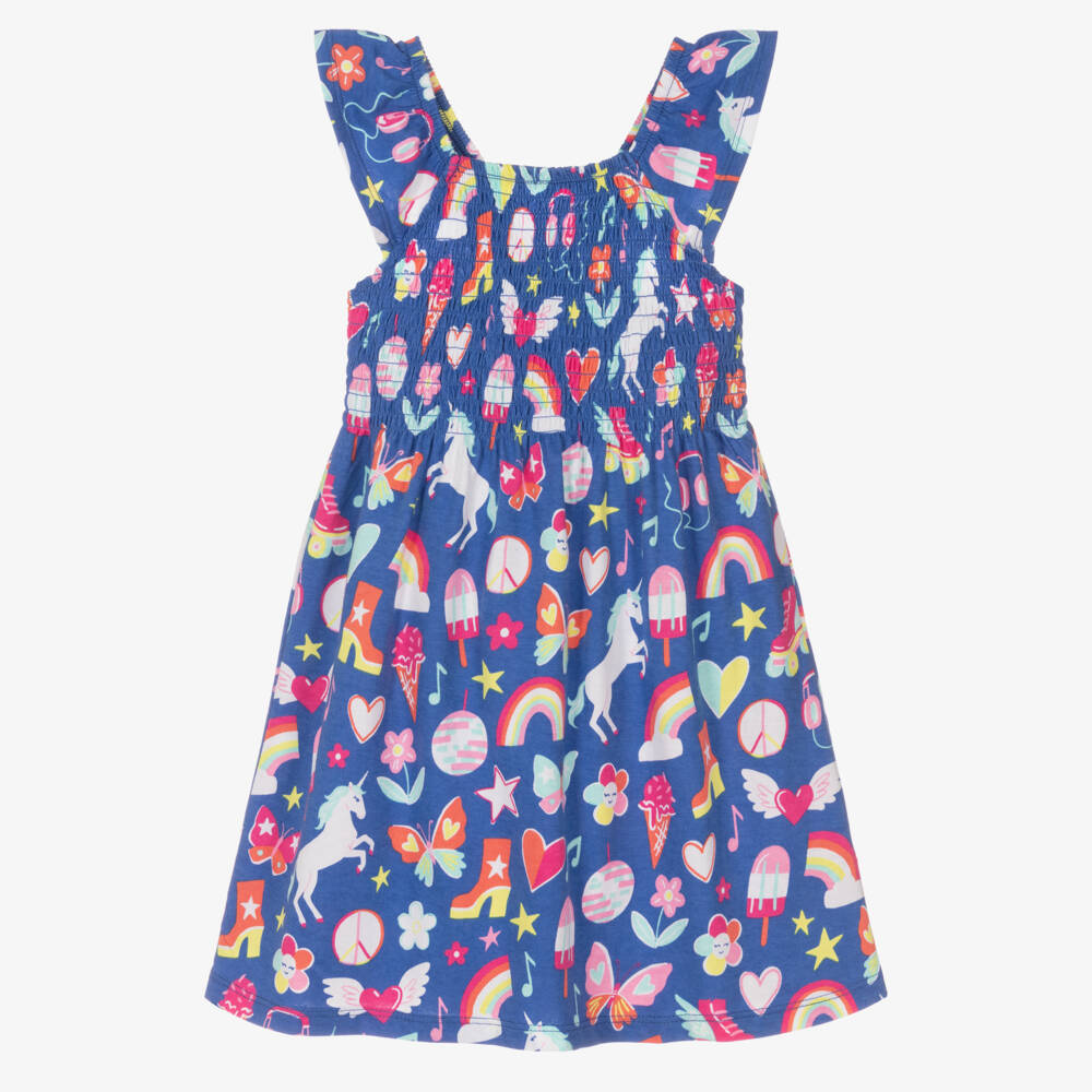 Pretty blue dress for girls by Hatley, made in soft cotton jersey for everyday comfort. Patterned with a colourful doodle print with unicorns, ice lollies and rainbows, this fun style has a stretchy shirred panel across the bodice and flutter sleeves.
