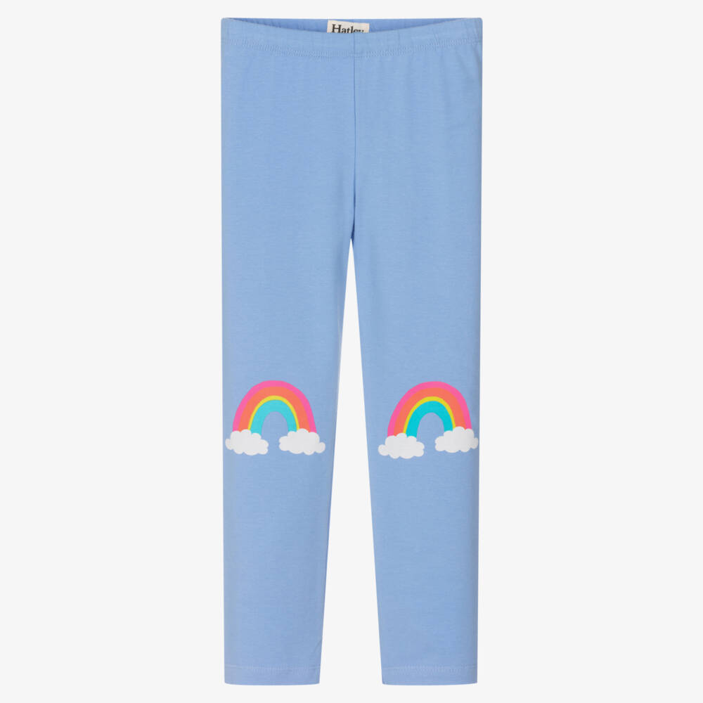 Cornflower blue leggings for girls by Hatley, made in super soft cotton jersey. The knees are printed with colourful rainbows for a cute and quirky look.