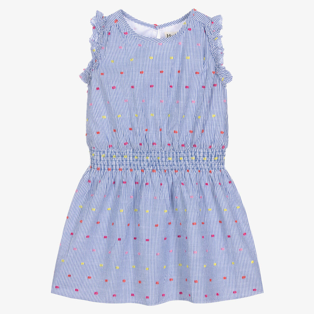 A dainty blue and white striped dress for girls by Hatley, finished with colourful plumeti detailing for a fun and playful twist. Made and lined in soft cotton, it fastens with a single button on the back, and has a dropped elasticated waist for a comfortable fit.