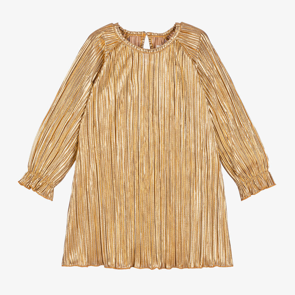 Gorgeous gold special occasion dress for little girls by Hatley. Made from shimmering plissé fabric that catches the light beautifully, it has an A-line shape and full, long sleeves with ruffle cuffs. This elegant design fastens with a stylish keyhole button on the back to complete the look.