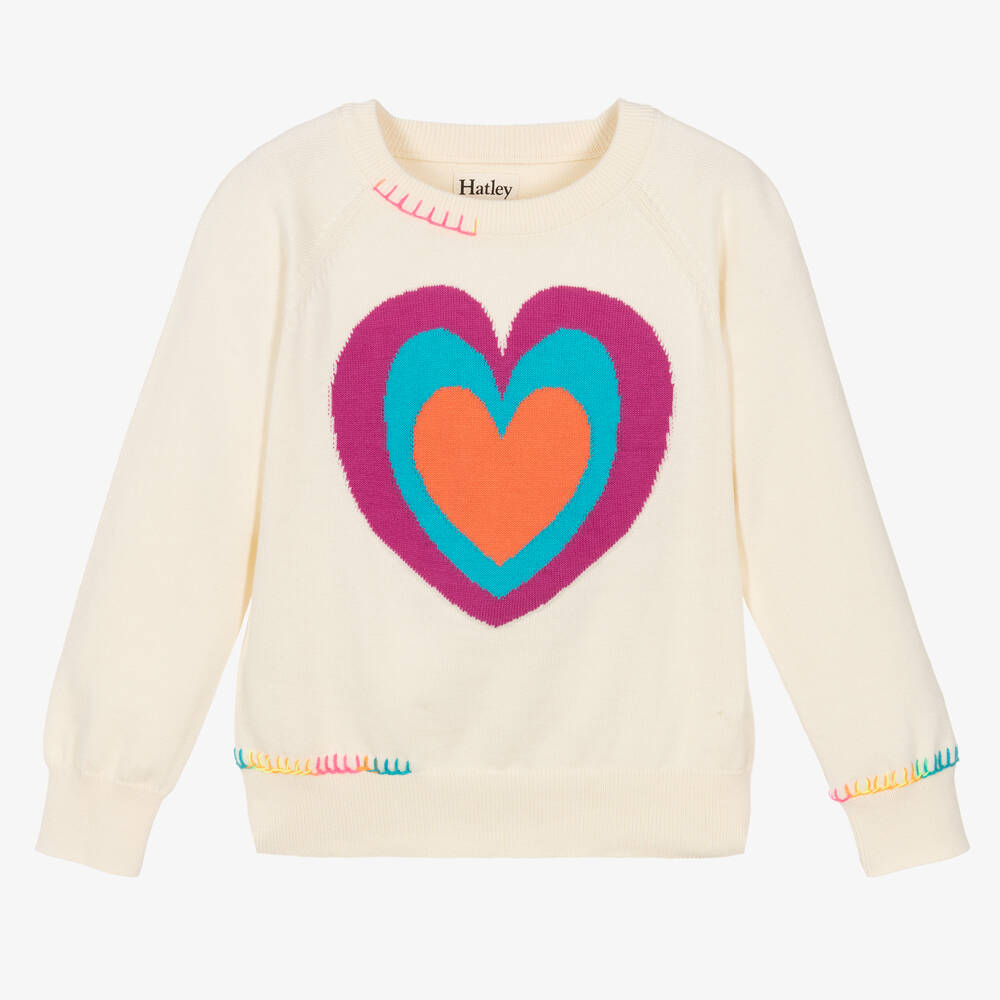 A fun ivory cotton sweater for girls from Canadian brand Hatley, made in a soft and comfortable lightweight knit. This long-sleeved jumper has a cute rainbow heart intarsia motif on the front and colourful stitching for a lovely vintage look.