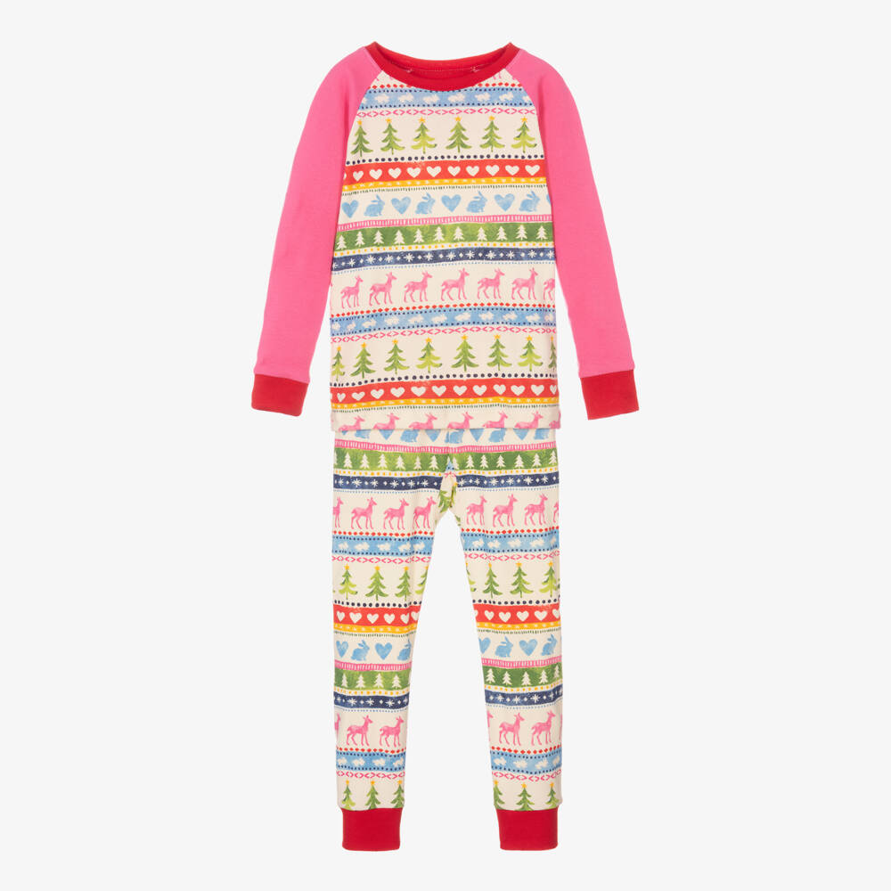 Festive ivory and pink pyjamas for girls by Canadian brand Hatley, patterned with green Christmas trees, pink deer, blue rabbits and hearts. Made in super soft, organic cotton, these comfortable, jersey pyjamas are snug-fitting for safety and have red ribbed trims for extra cosiness. The top as a pink embroidered logo on the back of the neck for a subtle designer touch, whilst the bottoms have a gently elasticated waistband for a comfortable fit.