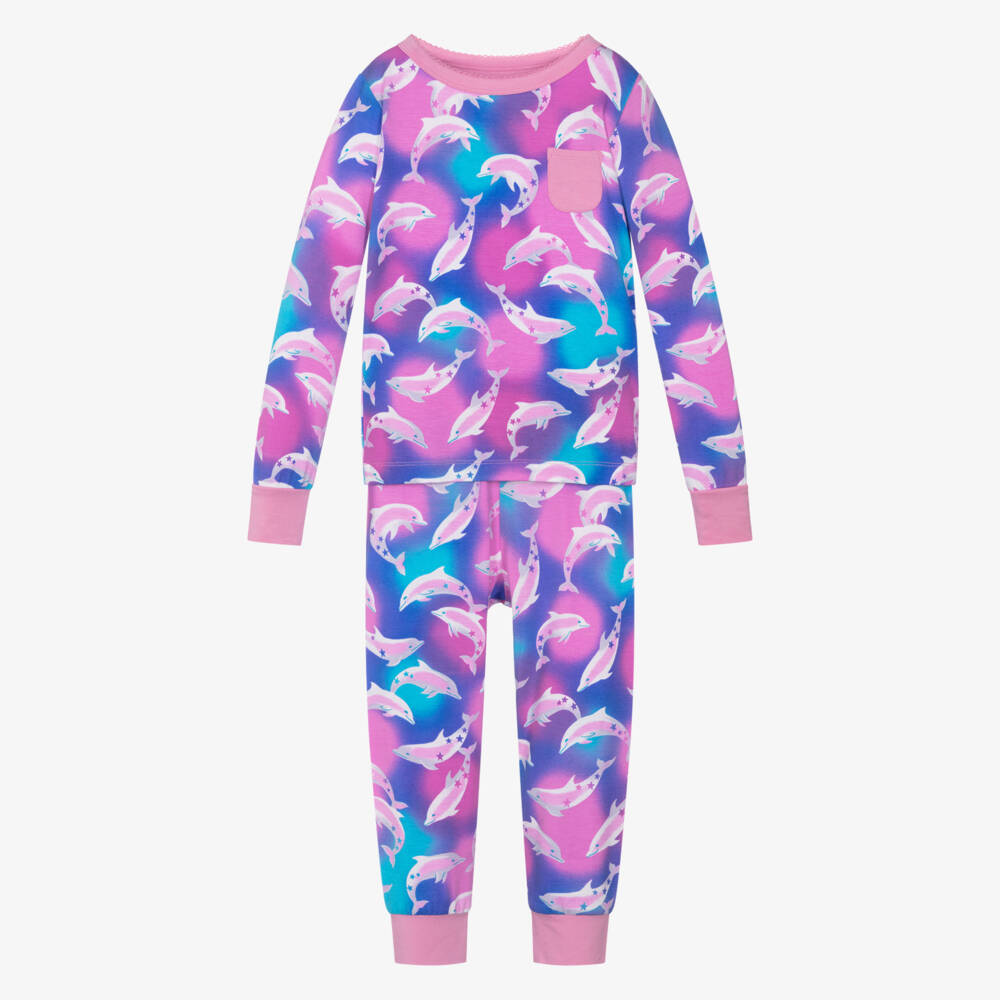 In shades of pink, purple and blue, these fun dolphin-patterned pyjamas for girls are by Hatley. Designed to fit snugly, they are made in soft, lightweight bamboo jersey. The top has delicate picot embroidery around the neckline and a small chest pocket. The trousers have a comfortable, gently elasticated waist.