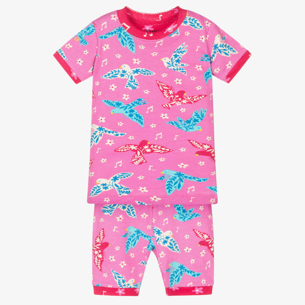 Girls short, snug fitting pink pyjamas by Hatley, made in soft, stretchy organic cotton jersey. The set has a lovely bird and flower print in pink, blue and ivory. They have dark pink trims and a pink embroidered logo on the back of the top.