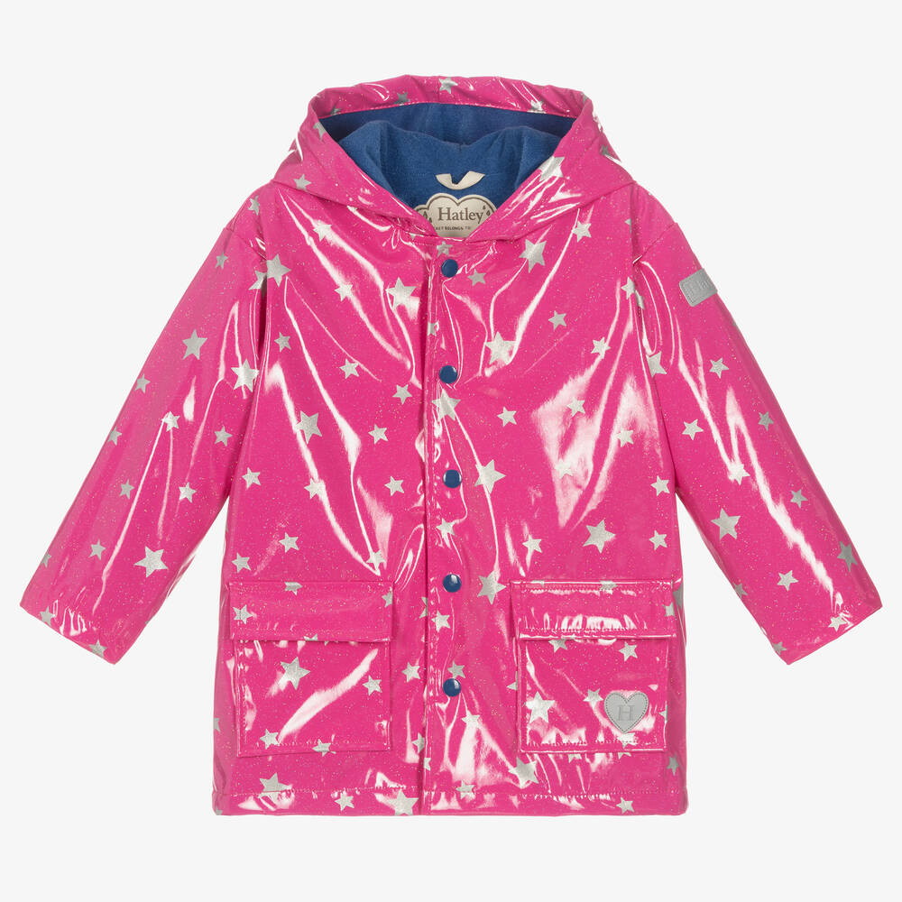 Pretty fuchsia pink hooded raincoat for girls by Hatley, made from impermeable, waterproof materials. This lovely raincoat has a sparkling silver stars print and a large hood to protect your little one from the elements. It has useful front flap pockets and is fully lined in soft, breathable blue microfibre fleece for added warmth. It fastens easily at the front with coordinating blue poppers and for added safety, it has reflective logo patches on one sleeve and one front pocket.