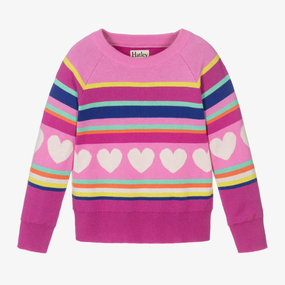 Lovely pink sweater for girls by Hatley, knitted in soft and lightweight cotton. This crew neck style has ribbed trims and a colourful heart and stripe pattern on the front and back.