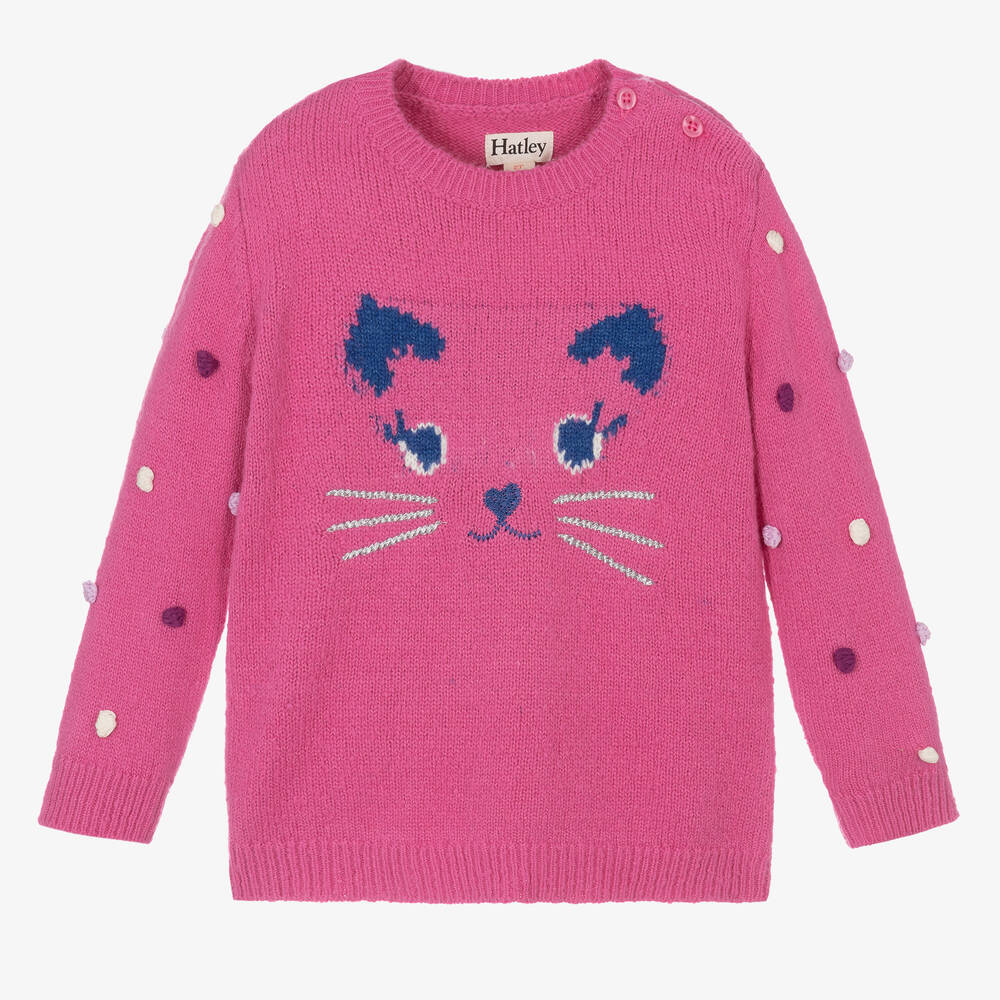 A cosy pink jumper for little girls by Hatley, knitted in a soft cotton blend. It features a cute kitten design on the front in blue and silver, with fun pom-pom detailing on the sleeves. There are ribbed trims for a snug fit and smaller sizes have button fastenings on one shoulder to help with dressing.
