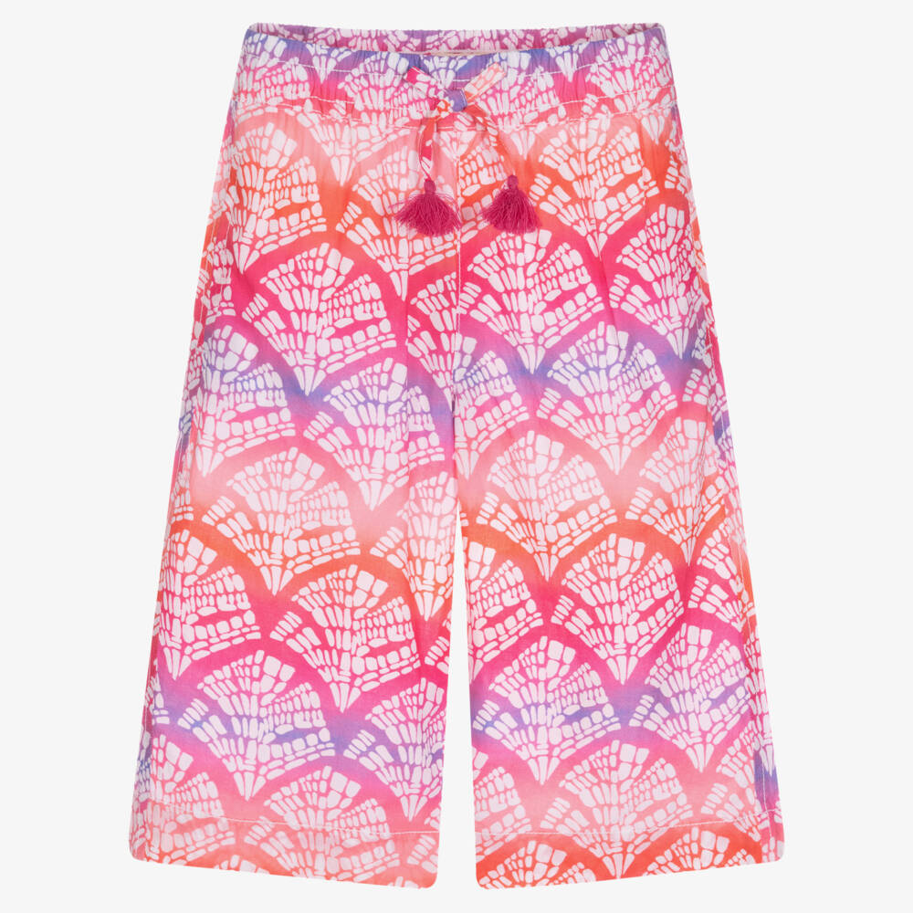 Pink cropped trousers for girls by Canadian brand Hatley, made in a lightweight cotton weave. In differing shades of pink and purple, these stylish trousers have an elasticated waist with concealed front pockets. There is a fixed bow on the front with tassel accents for a decorative finish. They are cut for a loose fit with a wide leg silhouette, making them an ideal choice for playtimes.