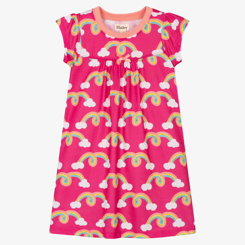 Fuchsia pink nightdress for girls by Hatley, with a colourful rainbow pattern and a pale pink ribbed crew neckline. Made in soft and comfortable jersey, it has a sweet satin bow on the front and is gathered from the bodice for a loose-fitting shape.