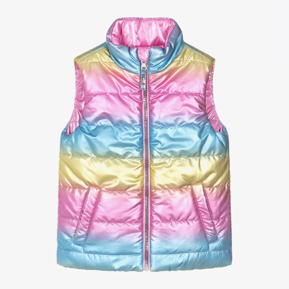 A fun and eye-catching reversible puffer gilet for girls by Canadian brand, Hatley. One side is in metallic rainbow ombré colours and the reverse side is glossy pink with a cool lightning bolt appliqué on the back. Smooth and lightly padded, this vibrant layering piece has pockets on both sides and fastens with a chunky silver zip.