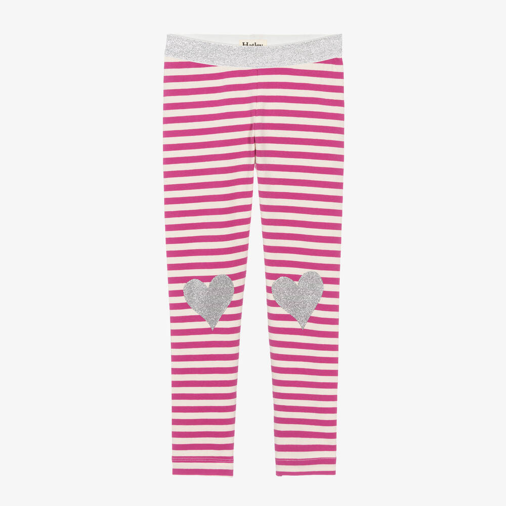 Pink striped leggings for girls by Hatley, made in soft and stretchy cotton jersey. The comfortable, elasticated waist has a fabulous silver sparkle, matching the glittery, heart-shaped patches on the knees.