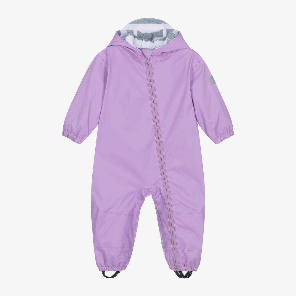A purple rainsuit for girls by Hatley, made in a smooth and lightweight waterproof fabric. Fun yet functional, it has a hood with a protective peak and a light reflective badge for high visibility. Your child can confidently jump in muddy puddles, fixed with elasticated foot straps that adjust with buttons to keep out the wet. Easy to take on and off, it secures with a full-length zip and has a soft towelling lining.
