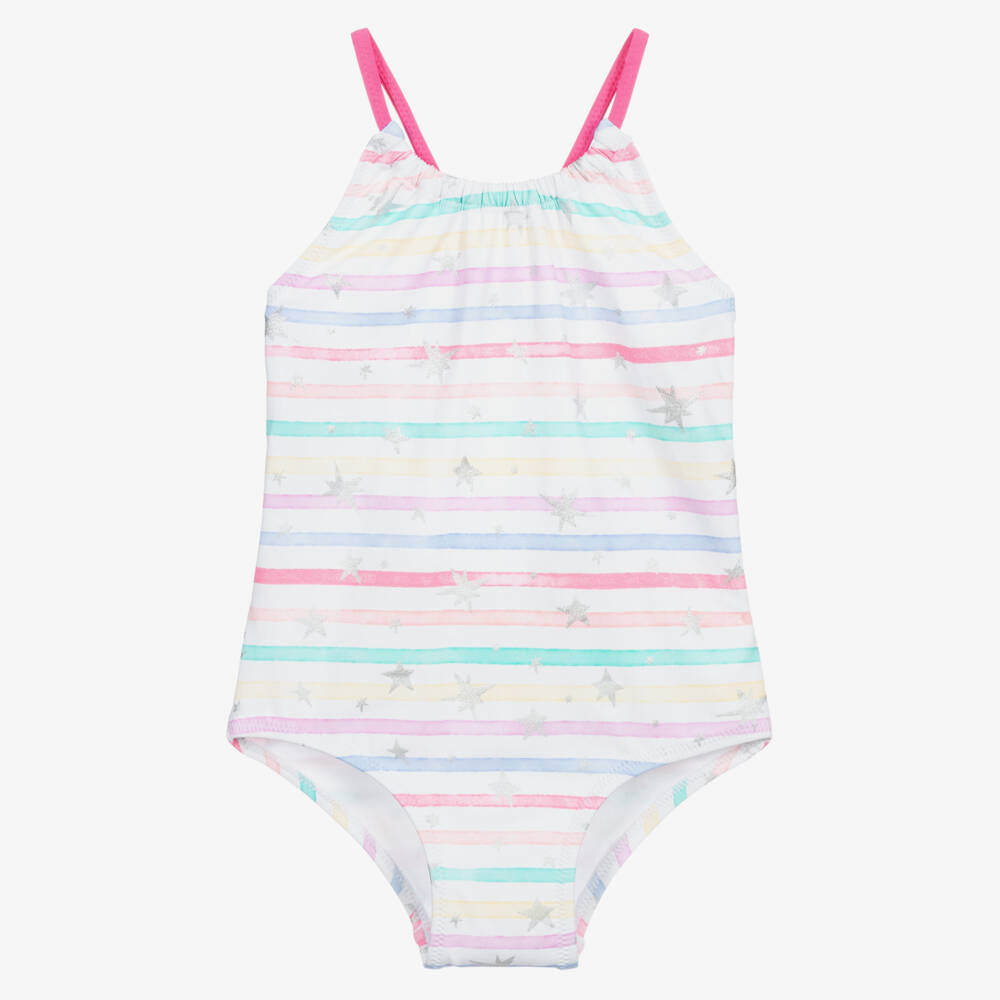 Girls white swimsuit by Hatley, with UPF50+ sun protection. It has a colourful stripe print with sparkling silver stars, pink straps and it is fully lined.
