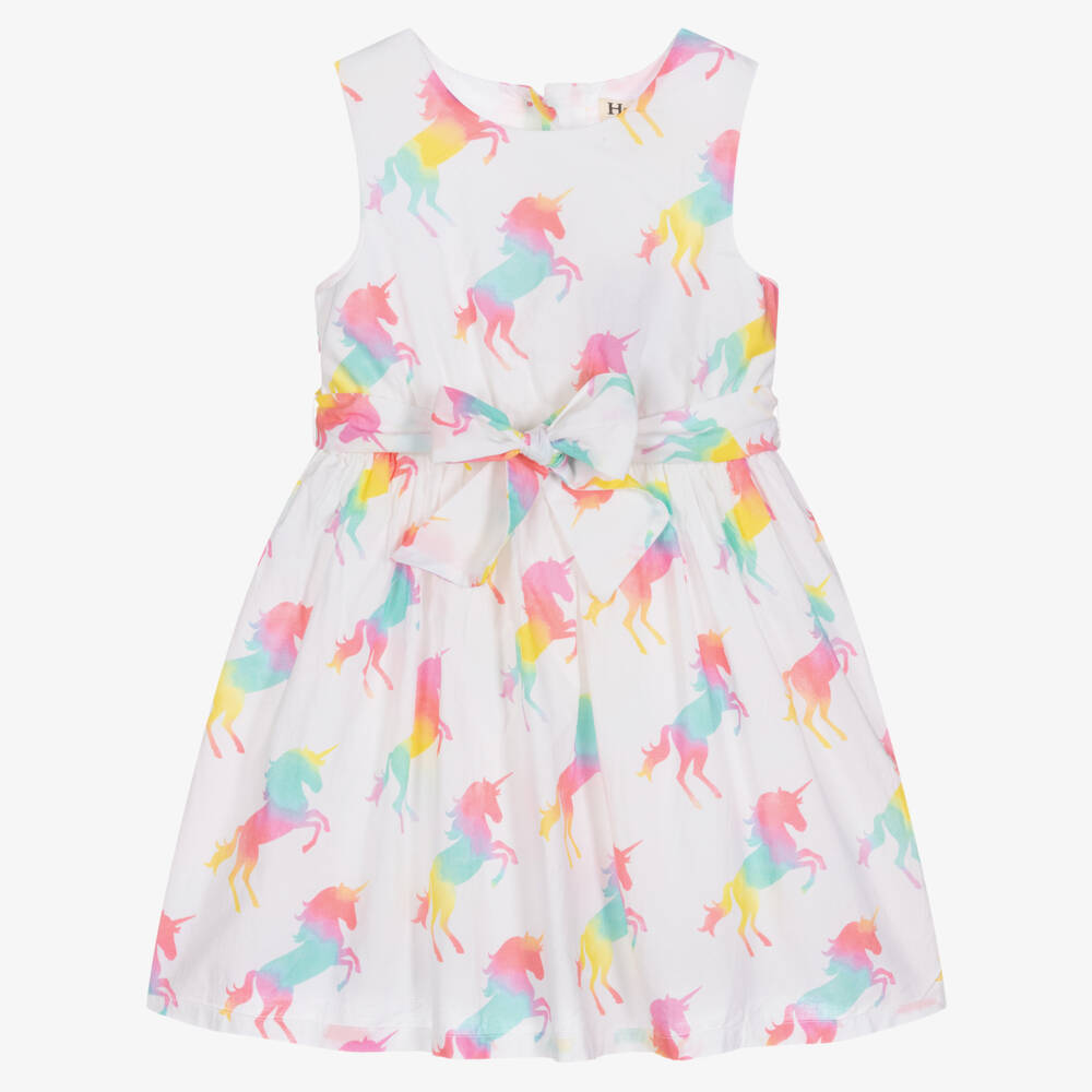 A sweet white dress for girls by Hatley, made and lined in a soft, lightweight cotton. It has a playful rainbow unicorn print all-over and features a tulle underskirt for a fuller and feminine silhouette. It has an elasticated waist with sash tie, and fastens with buttons on the back.