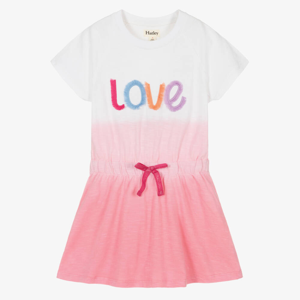 Cute white and pink ombré dress for girls by Hatley, made in soft cotton jersey. The front is decorated with pink, purple and orange tassels, spelling out 'Love'. The waist has a pink sparkly bow and elasticated trim, creating a lovely silhouette.