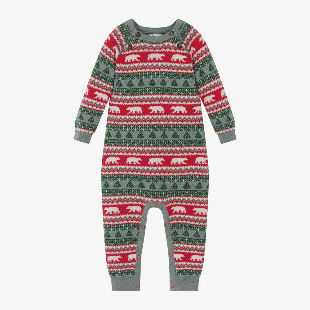 Both cute and festive, this grey and red babygrow for baby boys and girls is by Canadian brand Hatley. Made in soft, knitted cotton, it has a fun Fair Isle pattern with polar bears and Christmas trees. There are button fastenings on the shoulders and poppers between the legs for speedy changes.