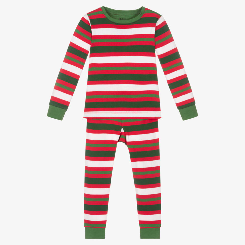 In a green, red and white candy cane stripe, these long pyjamas for boys and girls are by Hatley. Designed to fit snugly, they are made in soft organic cotton jersey and have ribbed trims.