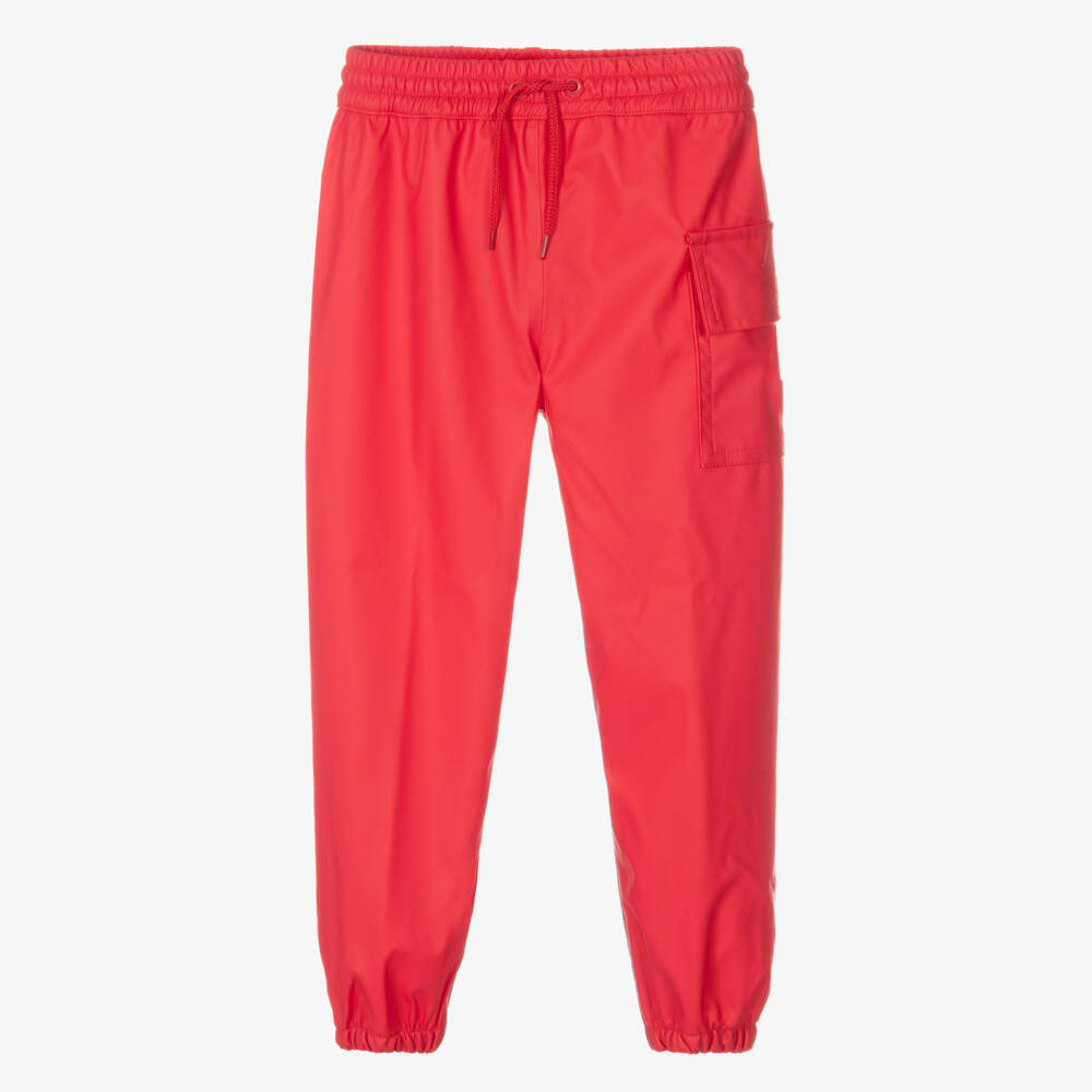 Red waterproof 'Splash' trousers by Hatley. Suitable for girls and boys, these practical trousers are great for active days in the rain and keeping undergarments clean and dry. They have an elasticated waistband and ankles, with an adjustable drawstring waist and a cargo pocket with velcro closure.