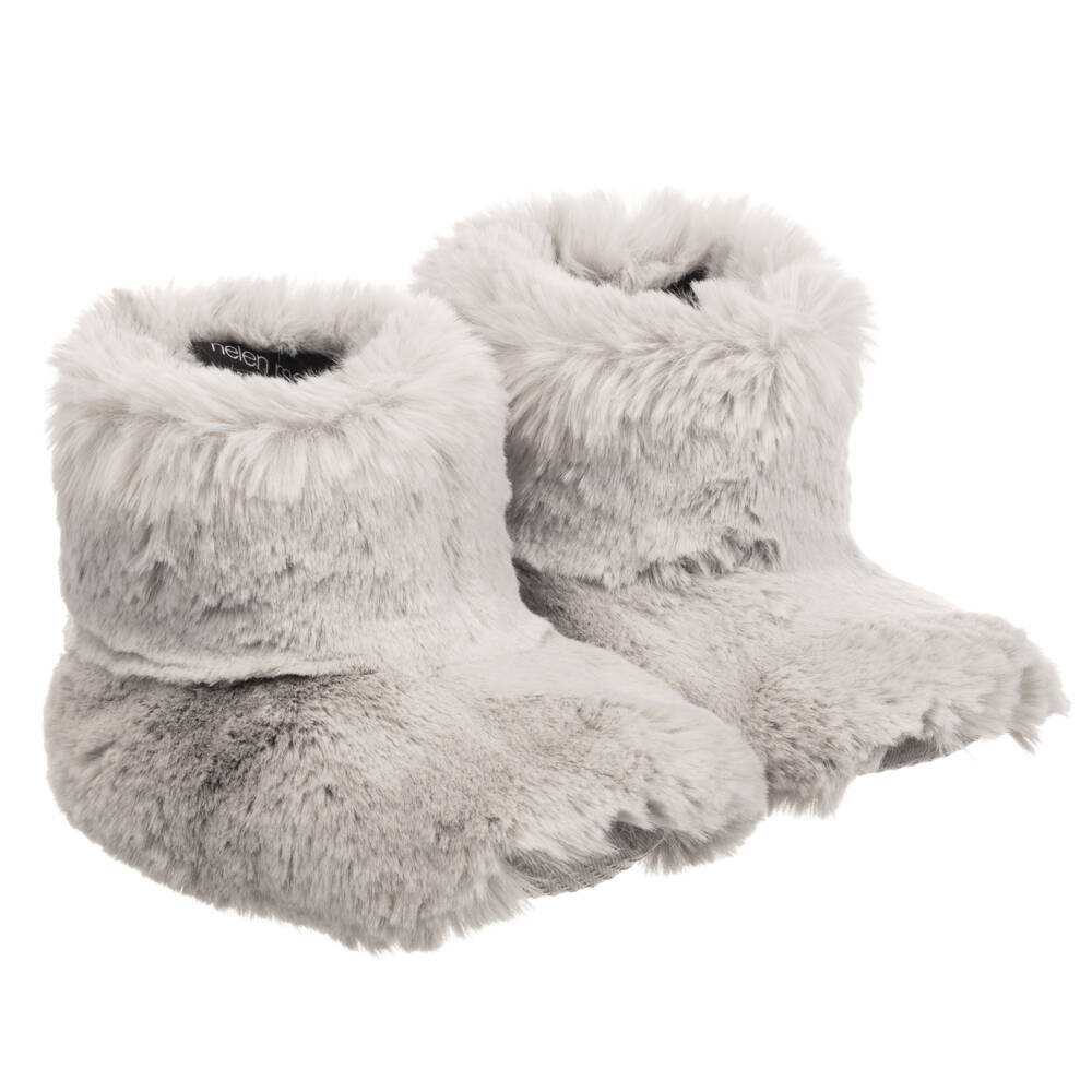 A pair of luxurious grey slippers for girls by British brand, Helen Moore. These boot style slippers are made from super soft faux fur with a warm black sherpa fleece lining. They have a comfortable padded inner sole and are non-slip, with rubber dimples on the grey soles.