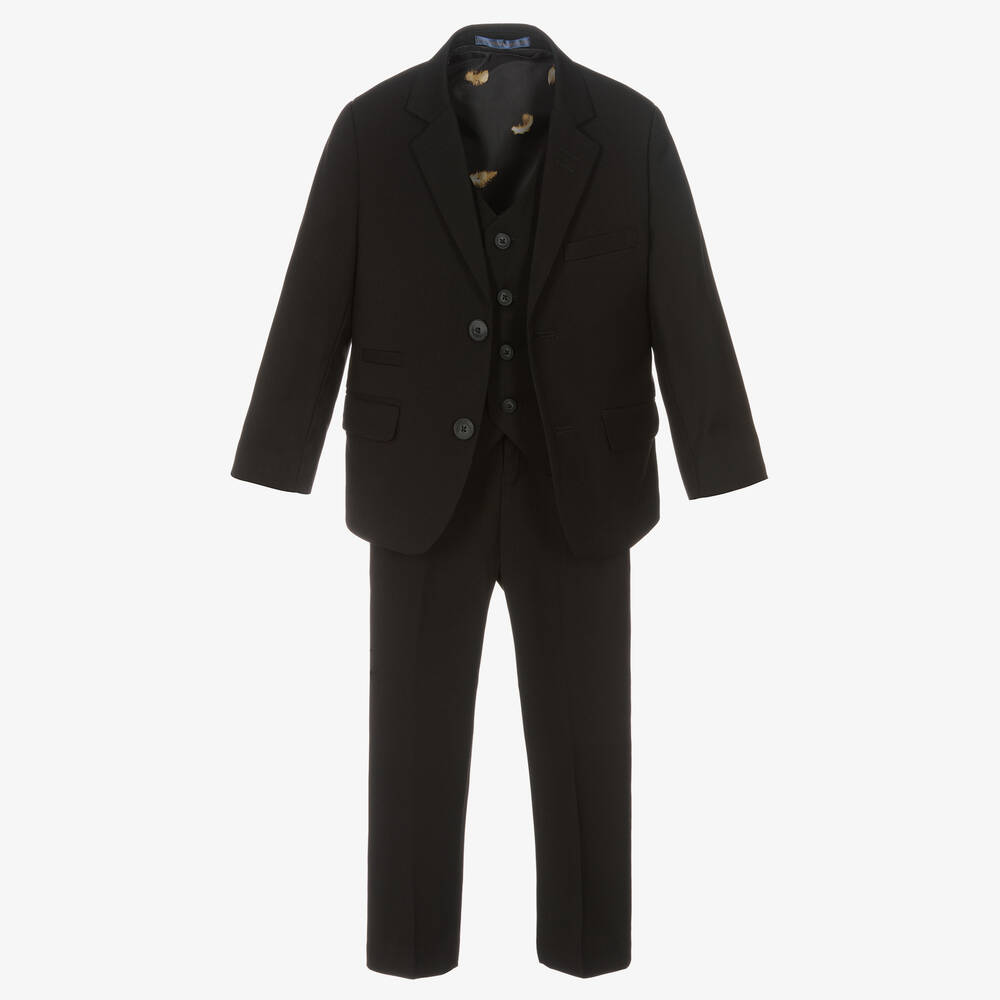 Smart black three-piece suit for boys by British brand House of Cavani. This soft and lightweight twill suit has a little stretch for a comfortable fit and ease of movement. The jacket and waistcoat are both lined in stunning satin printed with yellow feathers for an elegant touch, and they fasten with buttons on the front. The matching trousers have a part-elasticated waist, a smart crease down each leg and a secure back pocket.