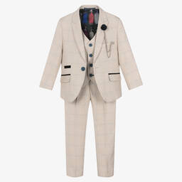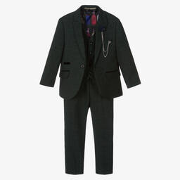 Boys three-piece Mini-me Caridi suit by House of Cavani, traditionally styled in a light blue and ivory check. The jacket has navy blue velvet trims and branded button fastenings. There is a removable navy blue floral pin with a silver chain and logo pin on the lapel for a contemporary twist. Both the jacket and blue satin-backed waistcoat have colourful bottle-patterned satin lining. The trousers have jetted front pockets, a buttoned back pocket and a part elasticated waist for a good fit.