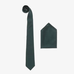 From House of Cavani, a green satin tie set for boys. Patterned with intricate polka dots, this smart tie comes with a matching pocket square for a complete look.
